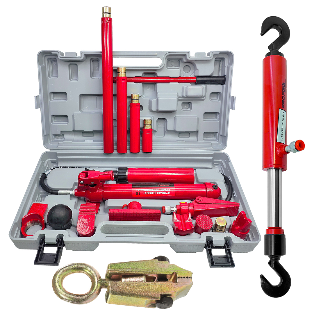 Комплект гидравлических распорок Profline рассчитан на максимальную нагрузку в 10 тонны. В состав комплекта входит гидравлическая помпа (насос), с помощью которого выполняется растяжка и рихтовка конструкций из металла и кузовов автомобилей. Гидравлический клин с помощью которого обеспечивается поднятие тяжестей при минимальном зазоре и комплект насадок.