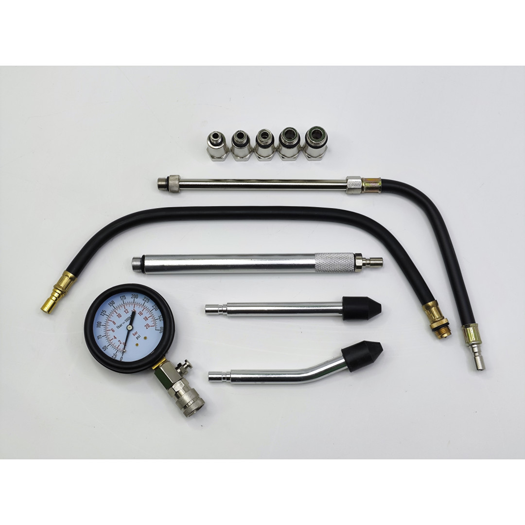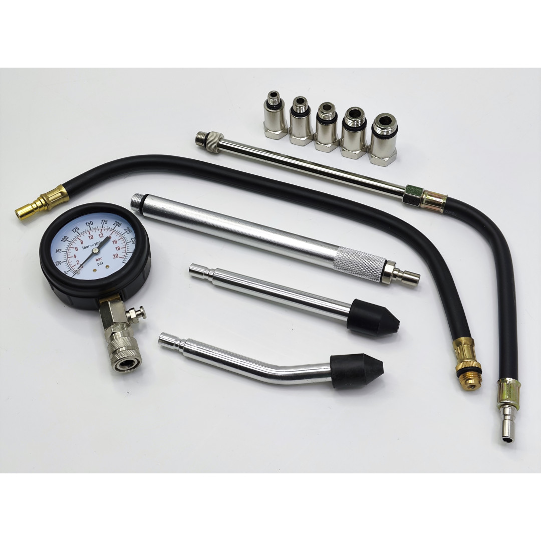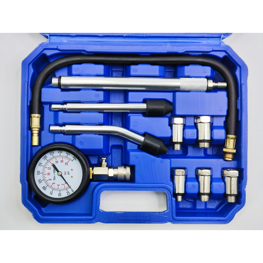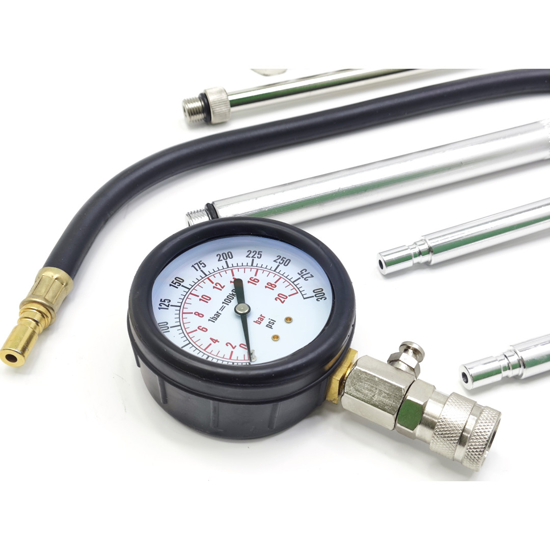 Профессиональный компрессометр для точного измерения компрессии в бензиновых двигателях легковых автомобилей. Диапазон 0–20 бар (0–300 psi), резиновый защитный чехол манометра, функция сброса давления. Набор включает удлинитель 500 мм, набор переходников для большинства свечных резьб (M10, M12, M14, M18, M20, M22) и конические адаптеры для прямого подключения. Подходит для большинства европейских, азиатских и американских авто.