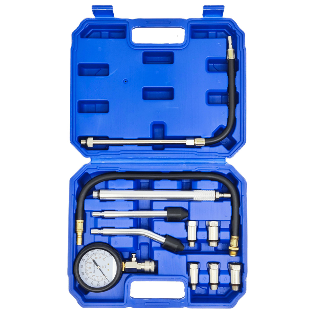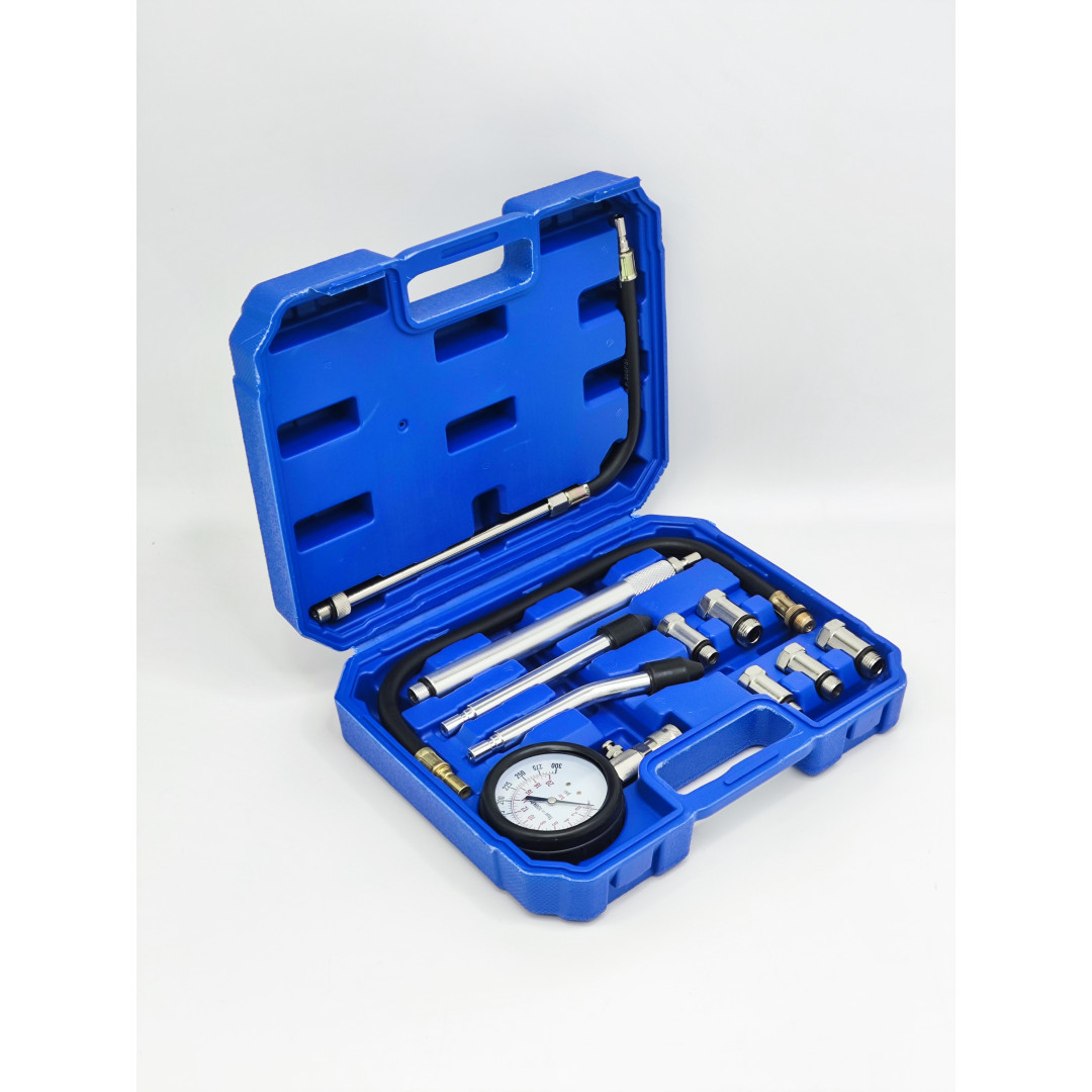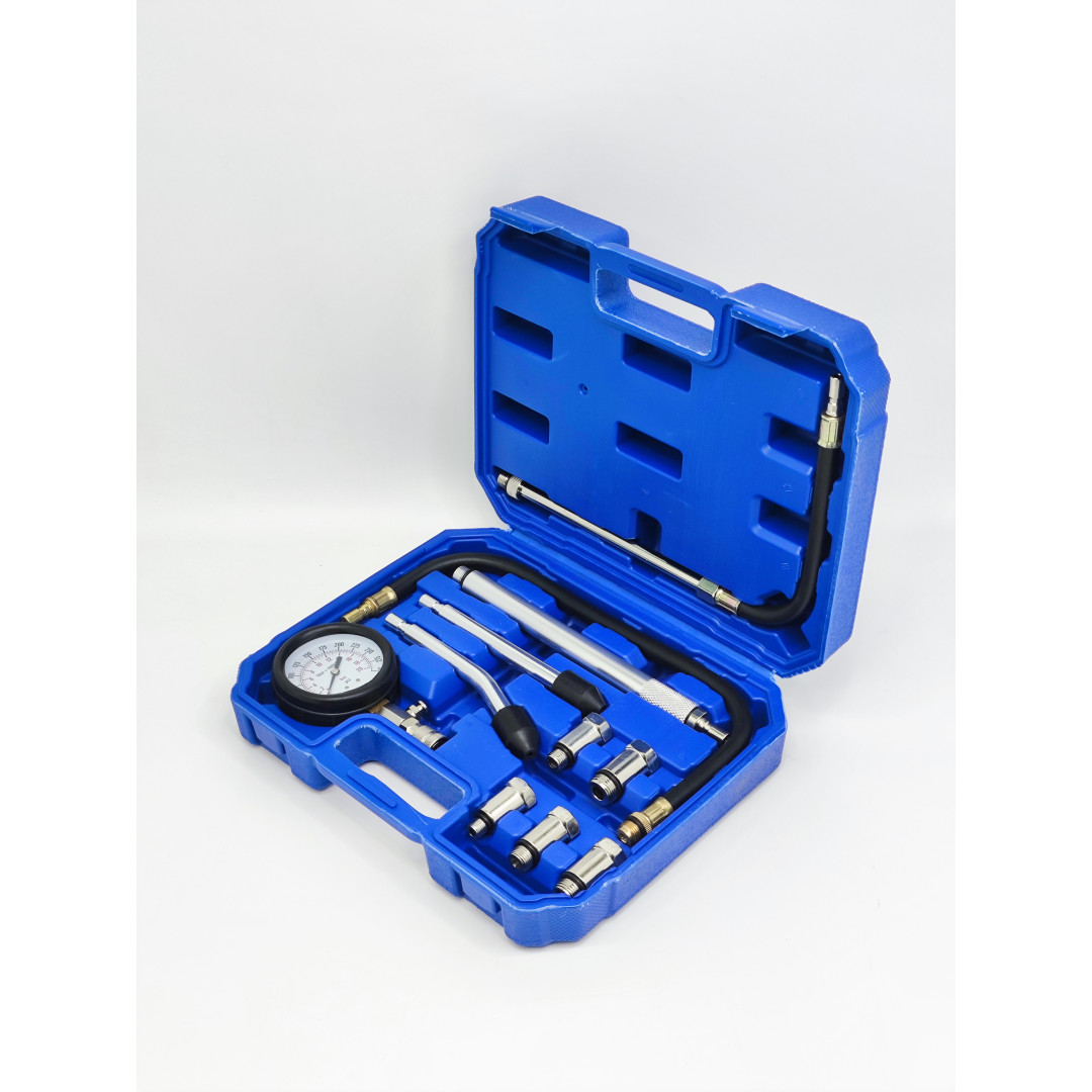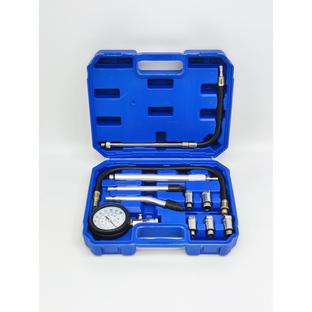Профессиональный компрессометр для точного измерения компрессии в бензиновых двигателях легковых автомобилей. Диапазон 0–20 бар (0–300 psi), резиновый защитный чехол манометра, функция сброса давления. Набор включает удлинитель 500 мм, набор переходников для большинства свечных резьб (M10, M12, M14, M18, M20, M22) и конические адаптеры для прямого подключения. Подходит для большинства европейских, азиатских и американских авто.