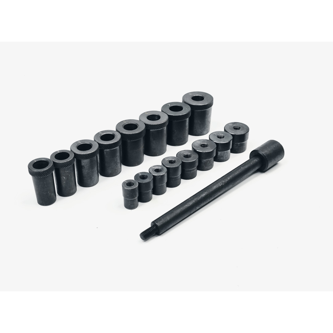 Универсальный профессиональный набор Profline 37451 предназначен для точной центровки ведомого диска сцепления при установке на маховик. Включает 8 ступенчатых оправок (пилотов) и 8 расширительных конусов, позволяющих работать практически со всеми легковыми и лёгкими коммерческими автомобилями (от Daewoo Lanos до Mercedes Sprinter). Центровка происходит быстро и точно — диск идеально садится на шлицы первичного вала КПП, исключая биение и вибрацию после сборки.