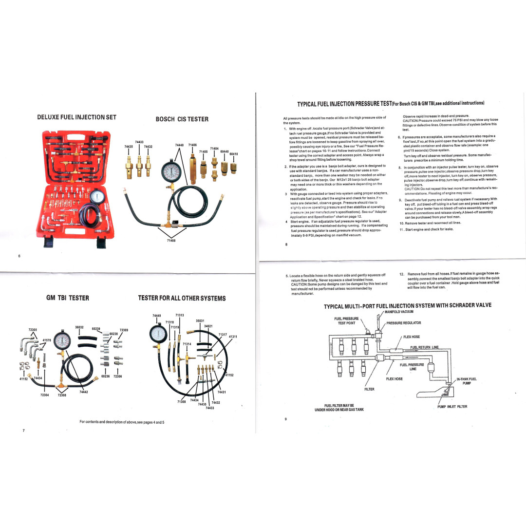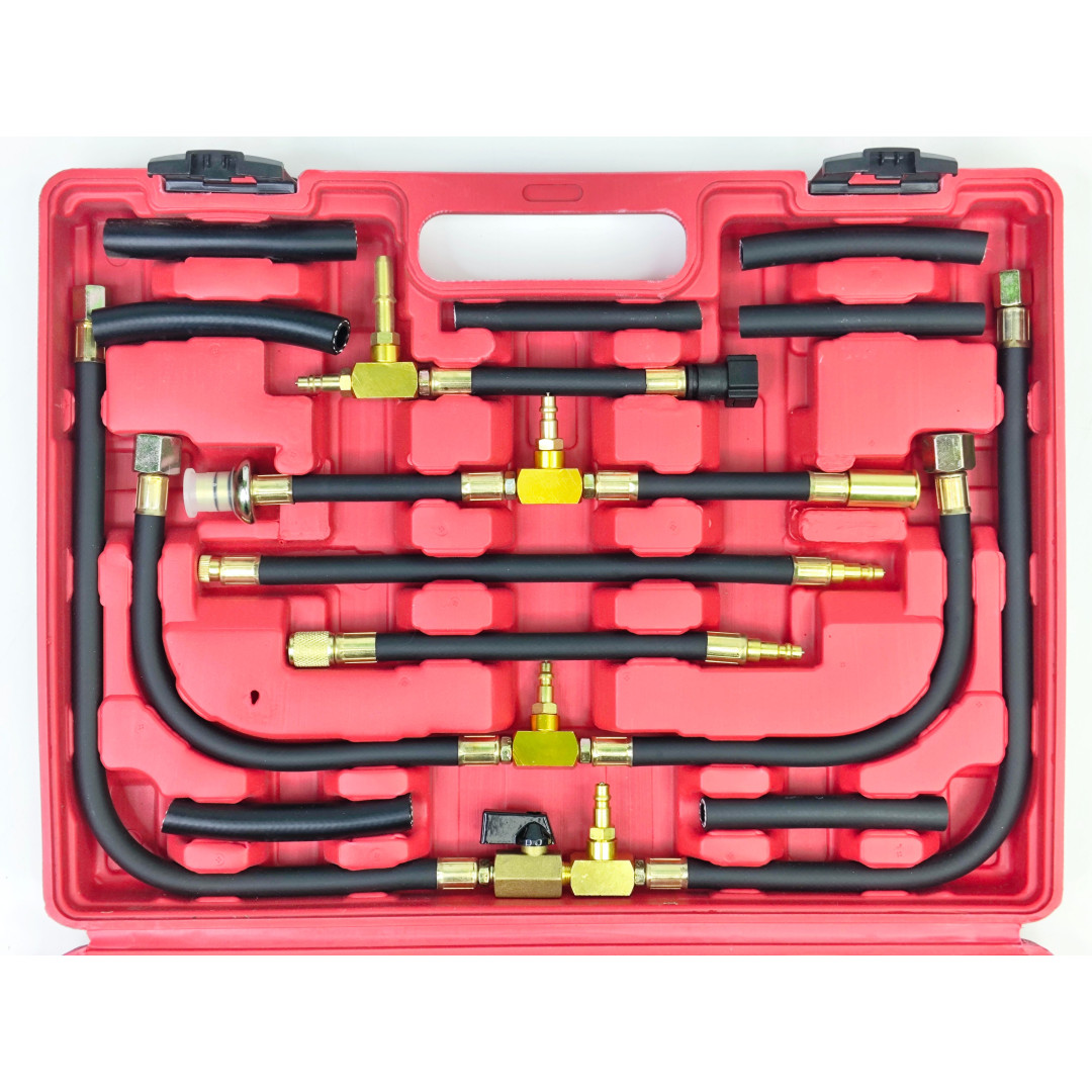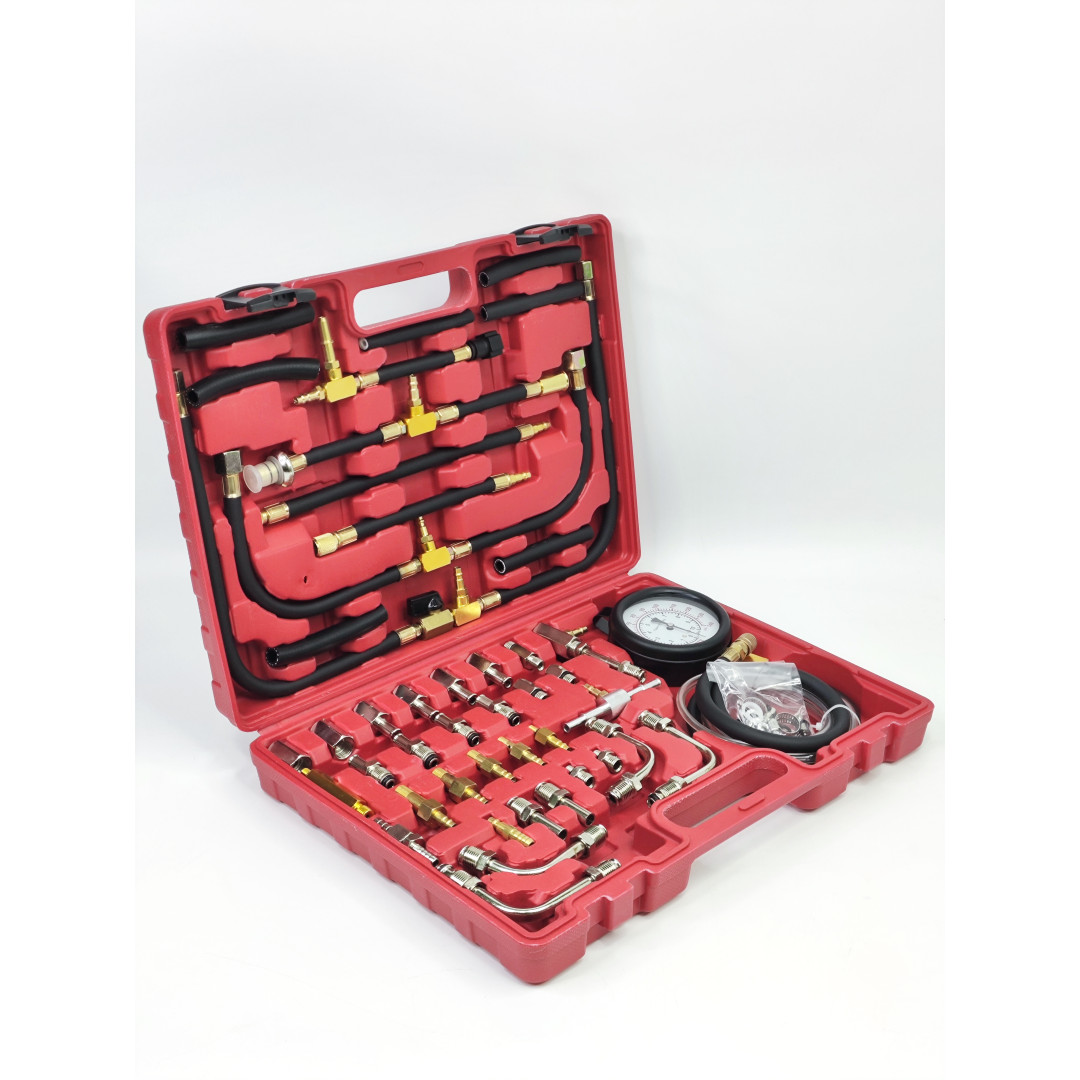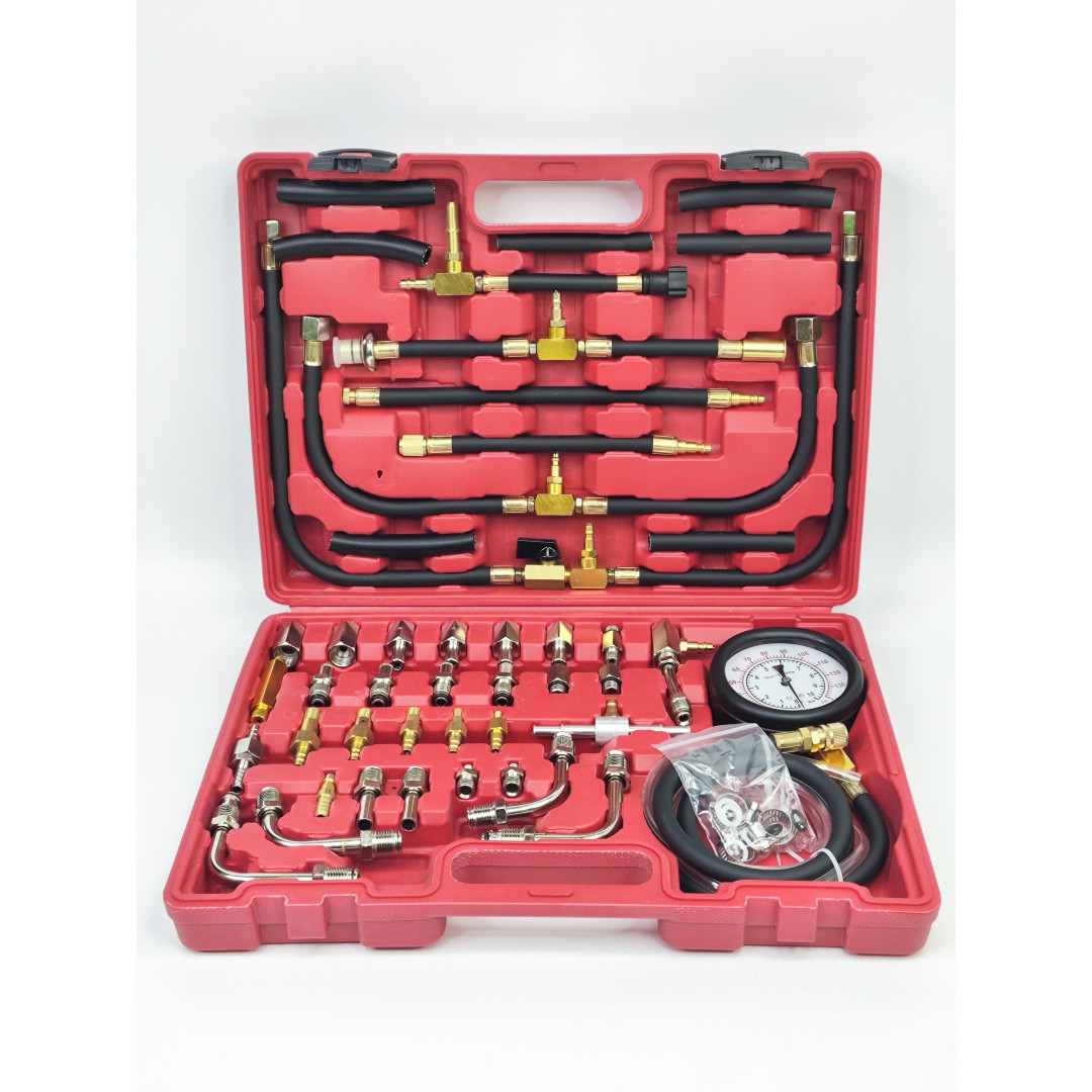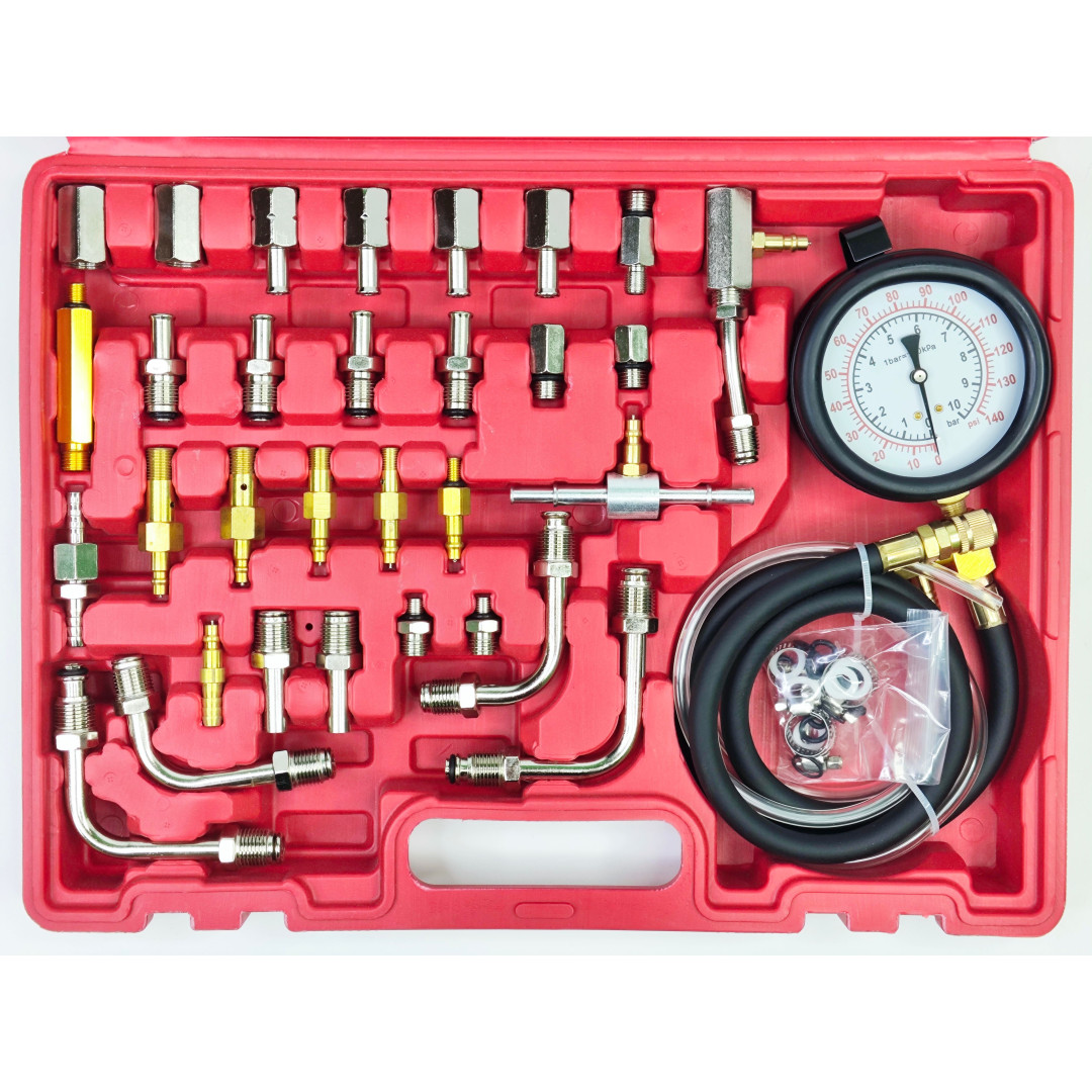 Набор Profline 31011 предназначен для профессионального измерения давления топлива в бензиновых инжекторных системах автомобиля. Комплект включает большой набор переходников, адаптеров, тройников и шлангов, что позволяет подключаться практически к любой топливной рейке или системе большинства производителей. Манометр на 10 бар (140 PSI) обеспечивает точные показатели и стабильную работу, а усиленные резиновые шланги гарантируют полную герметичность. Все элементы выполнены из высококачественной стали и латуни, устойчивы к воздействию топлива и рассчитаны на интенсивную эксплуатацию. Набор позволяет быстро находить неисправности в системе подачи топлива: потерю давления, неисправности насоса, регулятора или засорение магистралей.