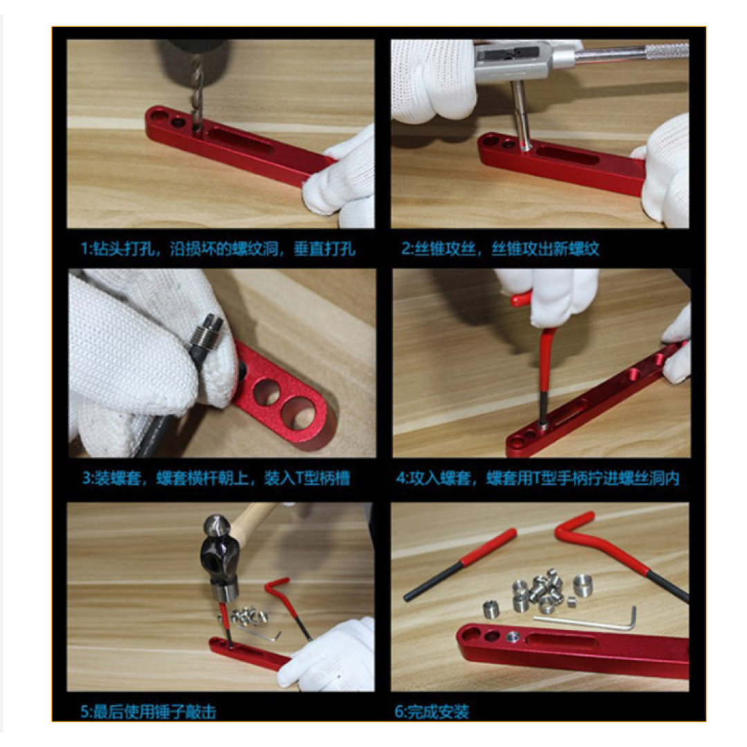 В комплект входят метчик и сверло из высококачественной быстрорежущей стали HSS4341, нажимная головка, пуансон и набор спиральных вставок.