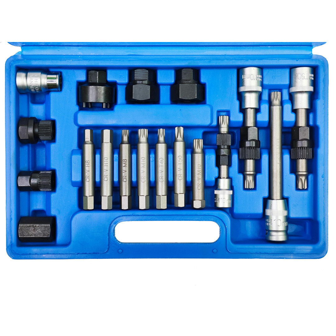 Демонтаж шкивов генераторов: Благодаря специальным ключам и насадкам набор позволяет снимать шкивы генератора без повреждений