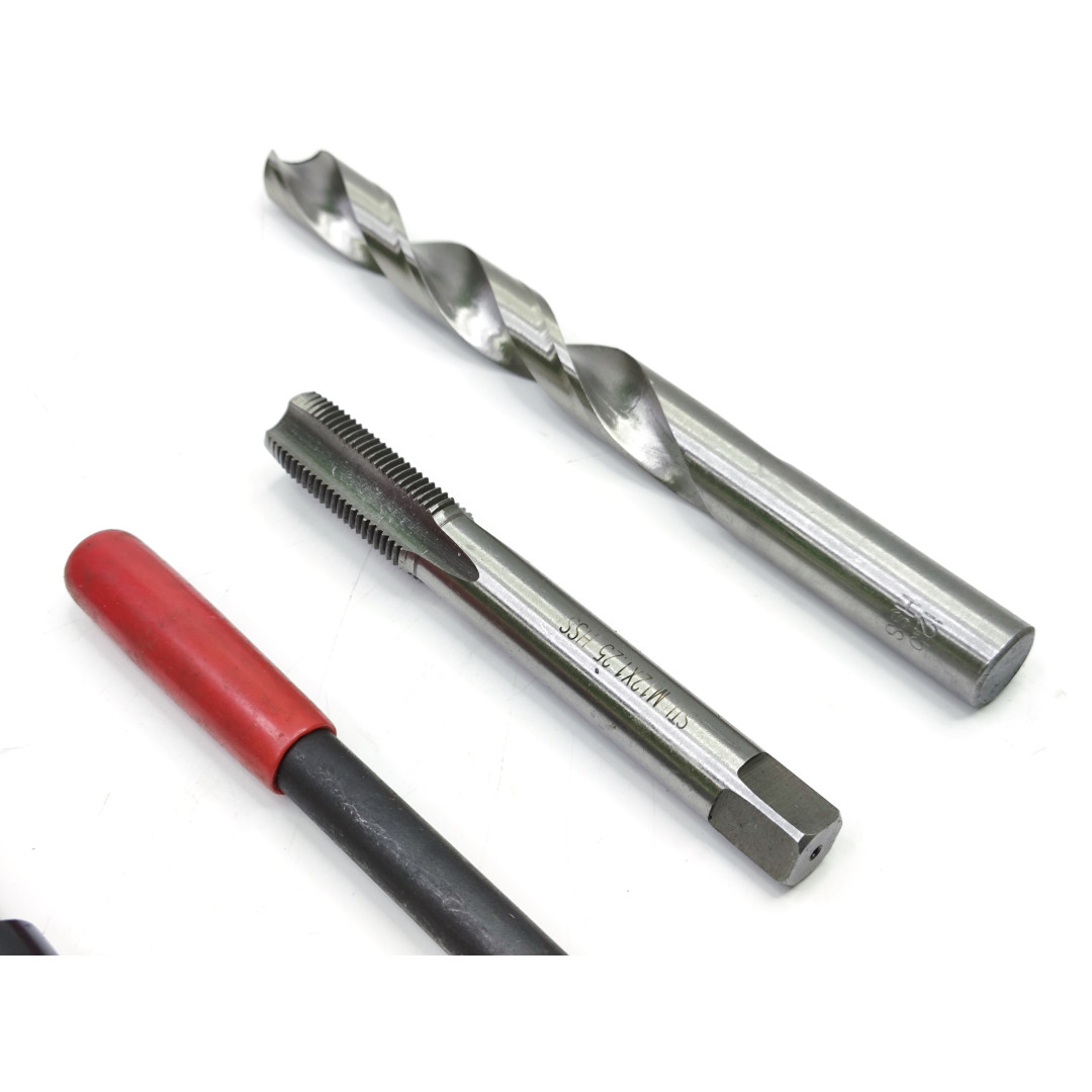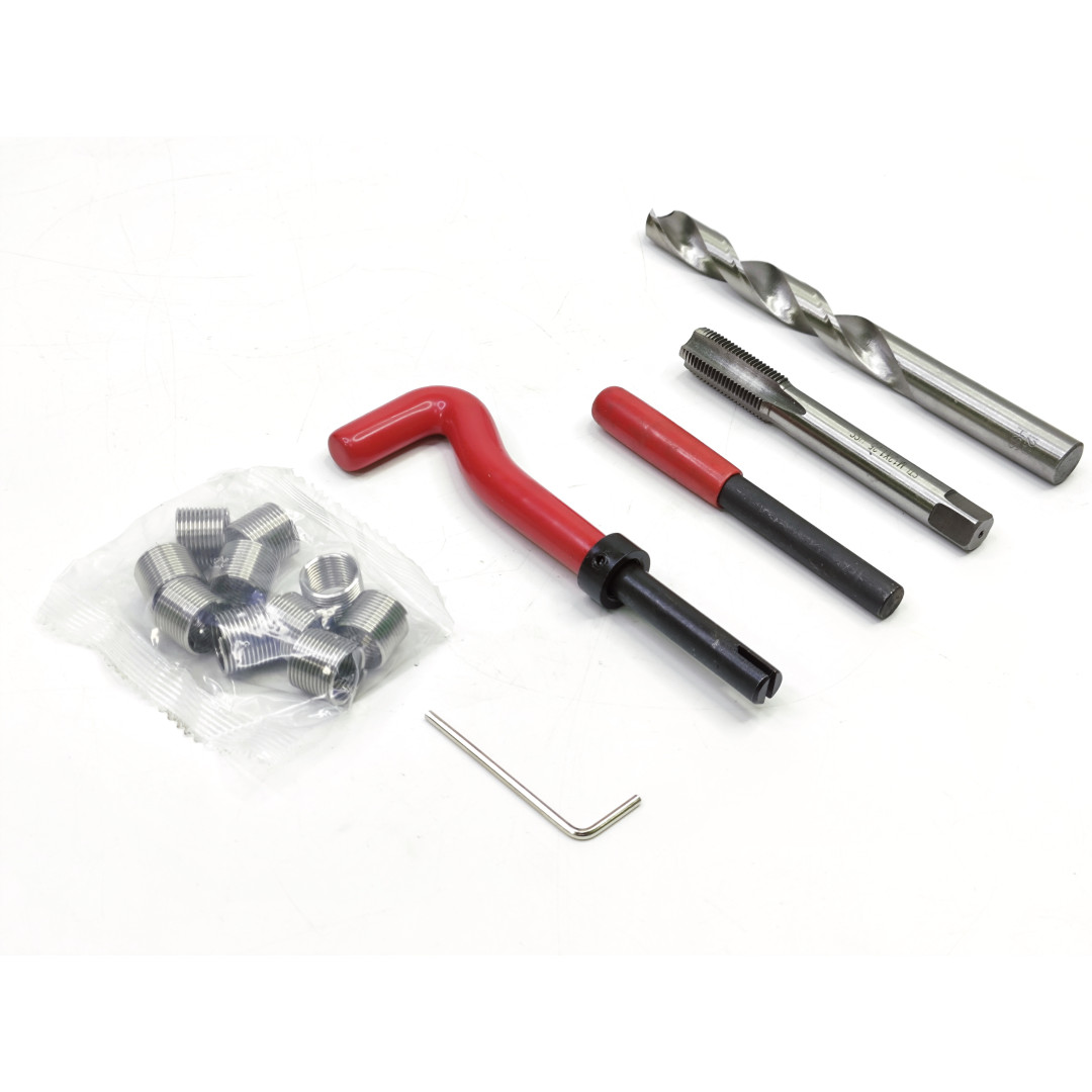 Комплект включает всё необходимое для ремонта: сверло для подготовки отверстия, метчик для нарезания новой резьбы, инструмент для установки вставки, а также инструмент для обламывания хвостовика после её монтажа.