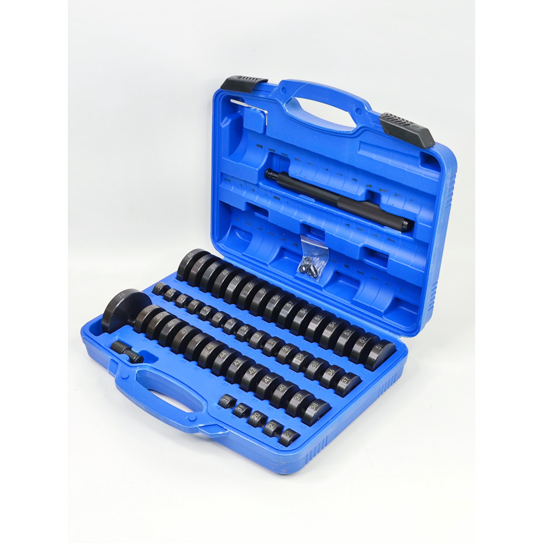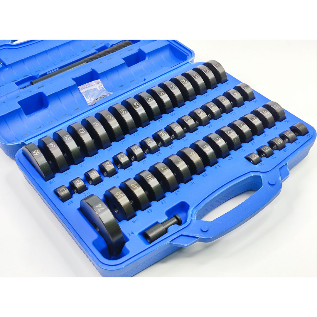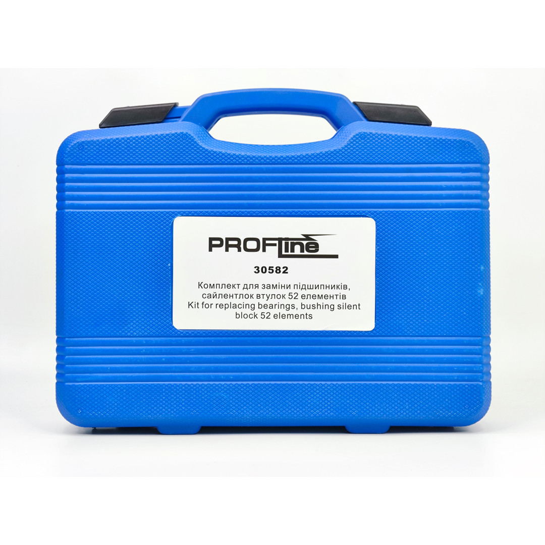 Профессиональный универсальный набор Profline 30582 (52 единицы) — один из самых полных комплектов на рынке для работы с подшипниками, сальниками, сайлентблоками, втулками и уплотнителями без повреждения деталей. Включает 49 оправок диаметром от 18 до 65 мм (шаг 1 мм) + оправку 74 мм + две рукоятки и шестигранный ключ. Идеально подходит для легковых авто, микроавтобусов, мотоциклов и многих промышленных задач.