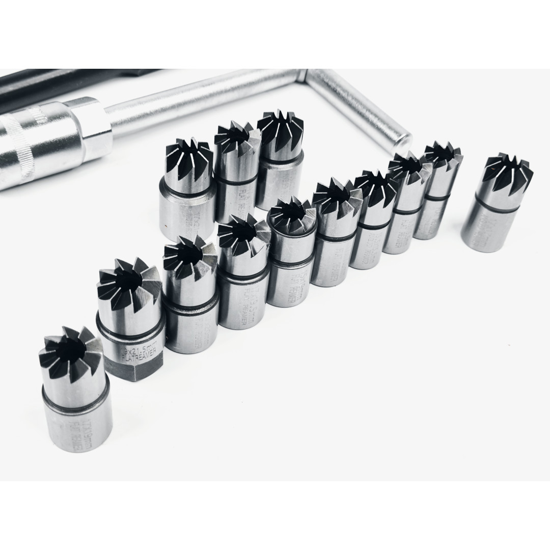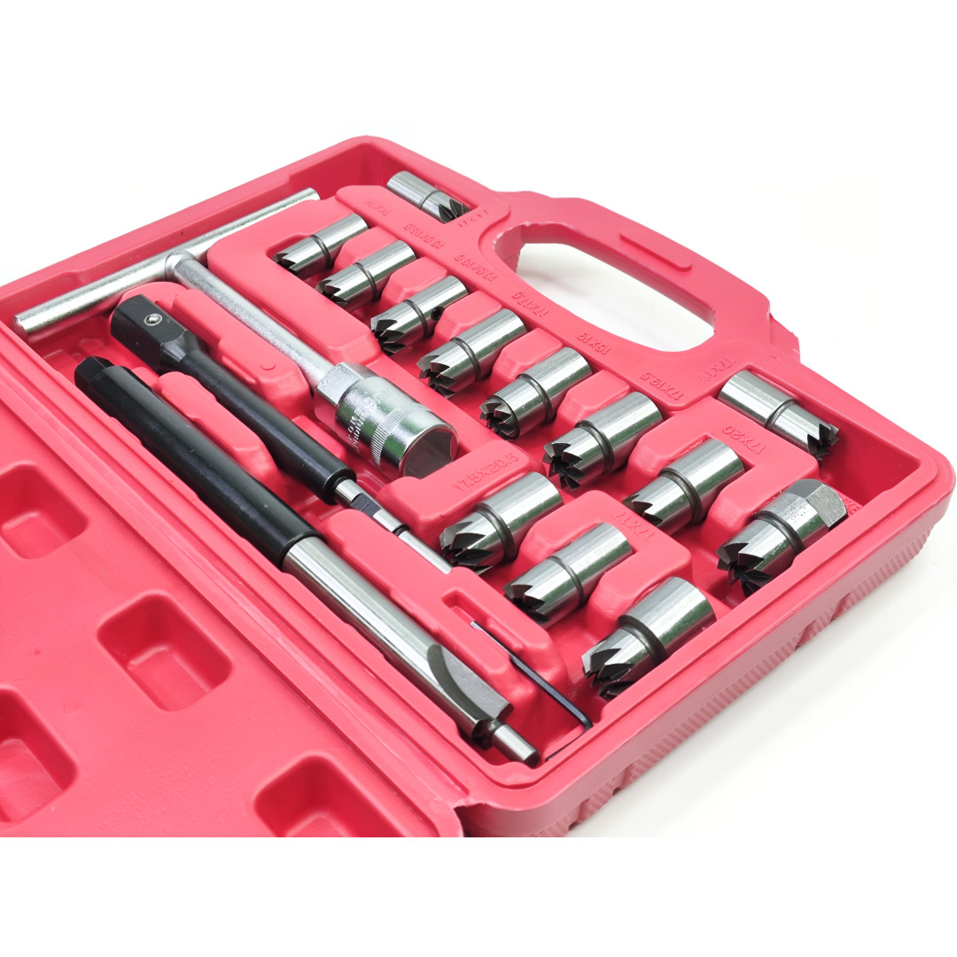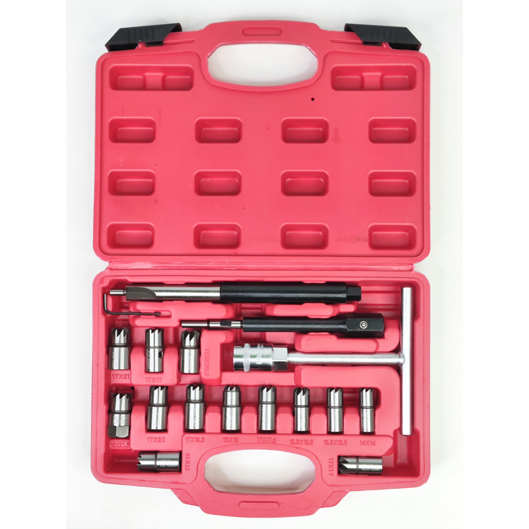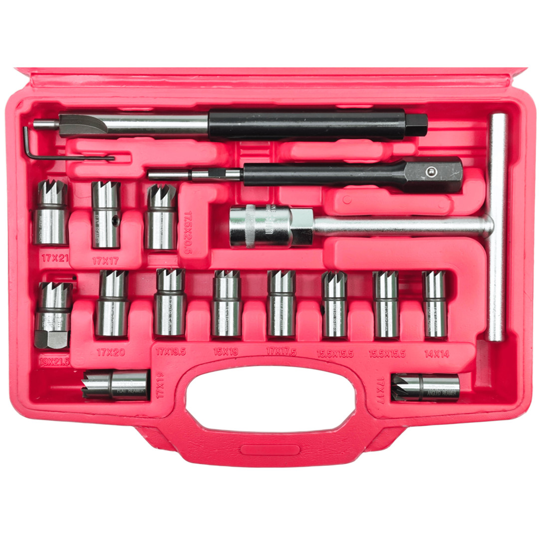 Профессиональный универсальный набор Profline 37865 (17 предметов) предназначен для восстановления и очистки посадочных седел (гнёзд) под форсунки Common Rail и насос-форсунки в головках блоков цилиндров дизельных двигателей. Включает набор разнопрофильных фрез (плоские, угловые 30°/60°/90°, радиусные), центрирующие пилоты и Т-образный держатель. Позволяет быстро удалить нагар, ржавчину и микродеформации, обеспечивая идеальную герметичность прилегания форсунки без замены ГБЦ.