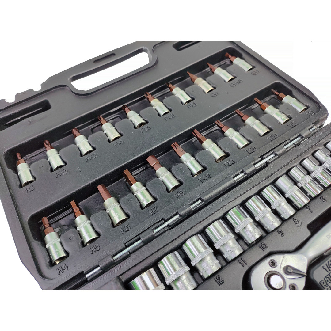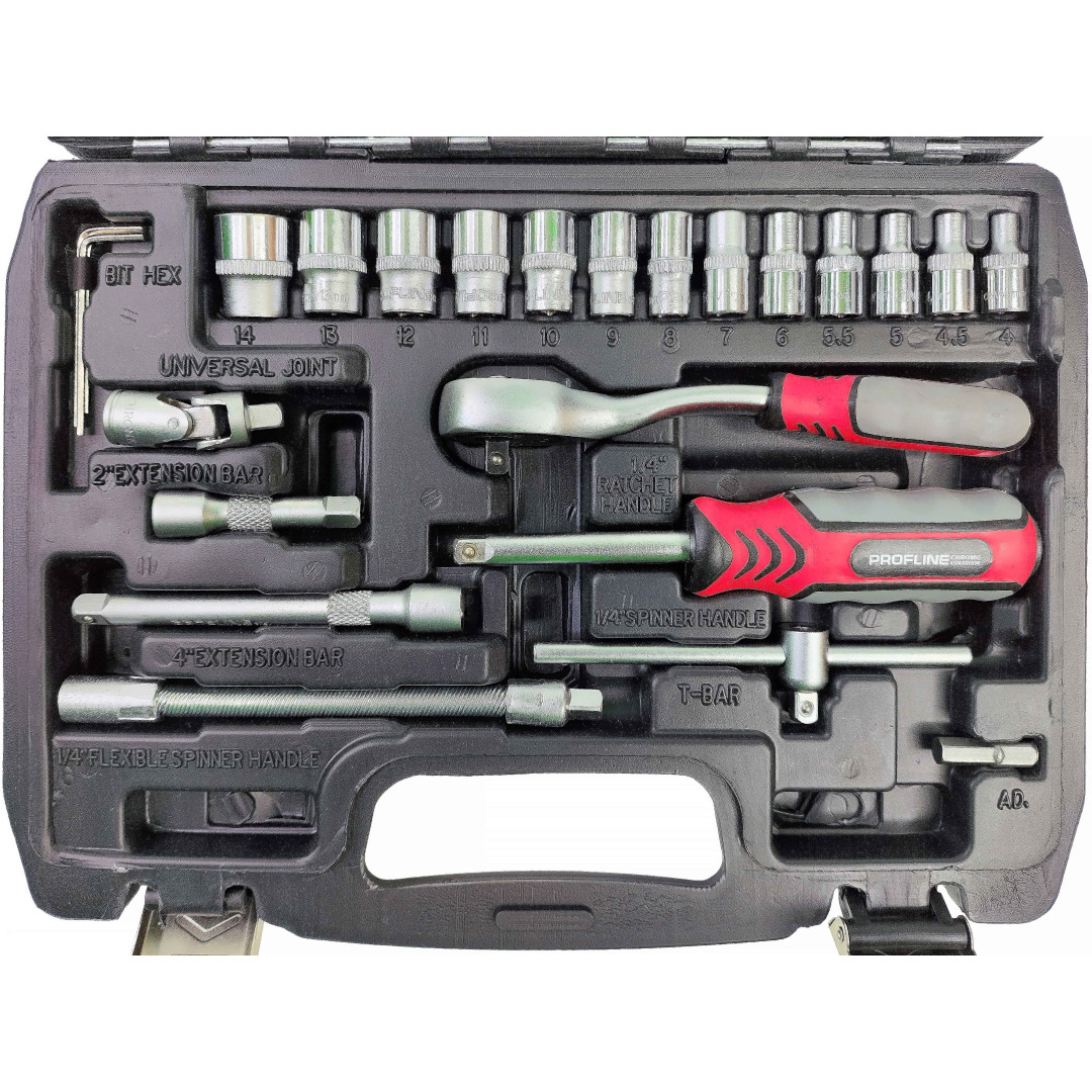 Трещеточная рукоятка1/4" на 48 зубцов; Шестигранные торцевые головки на 1/4": 4-14 мм