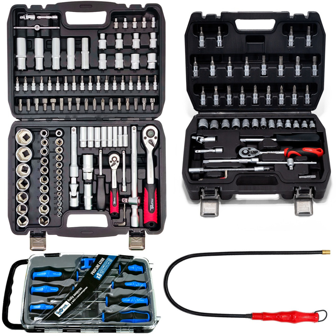 Набор инструмента 4в1 (профессиональный набор инструментов 108 ед + набор отверток профессиональных в кейсе 7 ед с намагничивателем + магнит на гибком удлинителе + набор инструментов 46 ед 1/4") Profline 61085-310