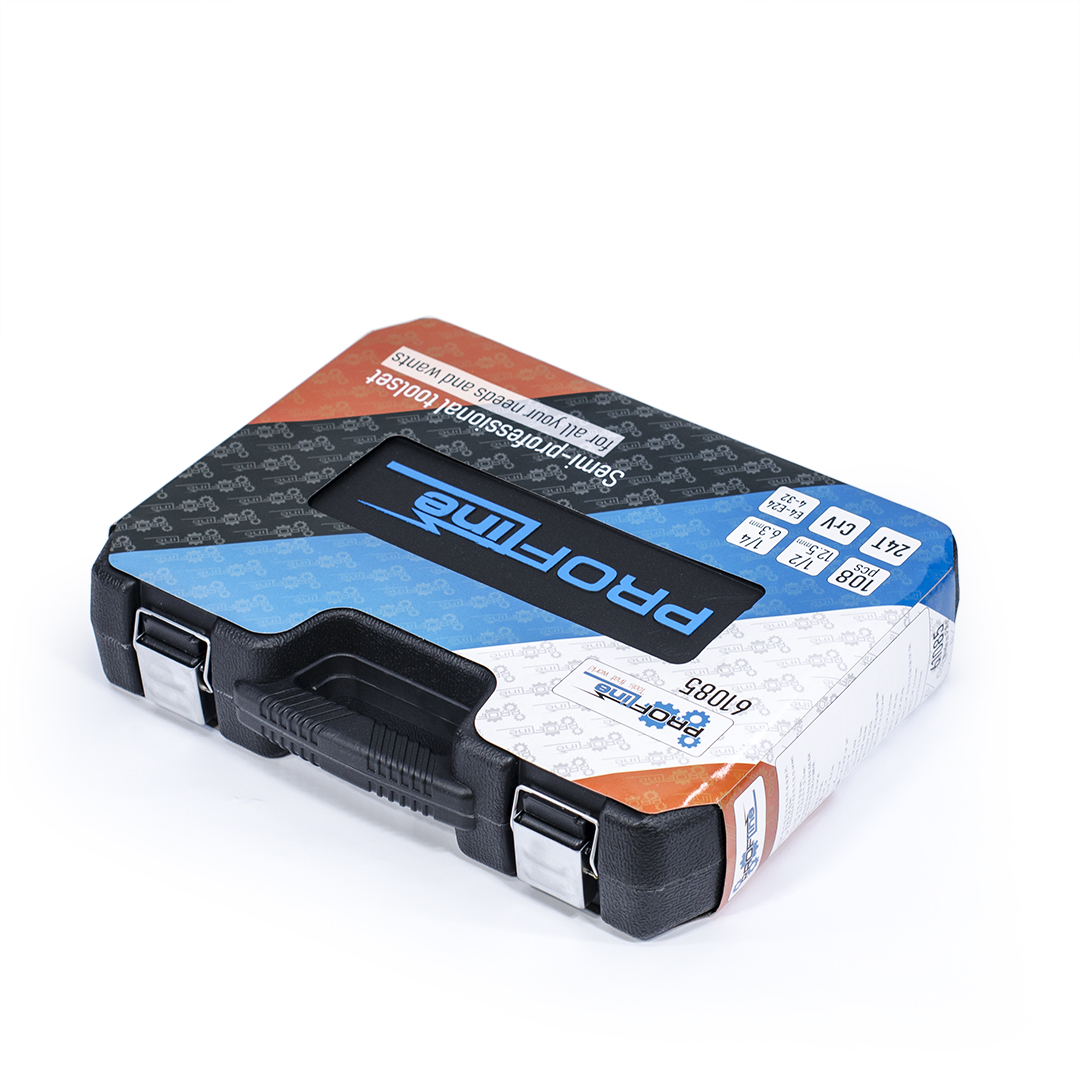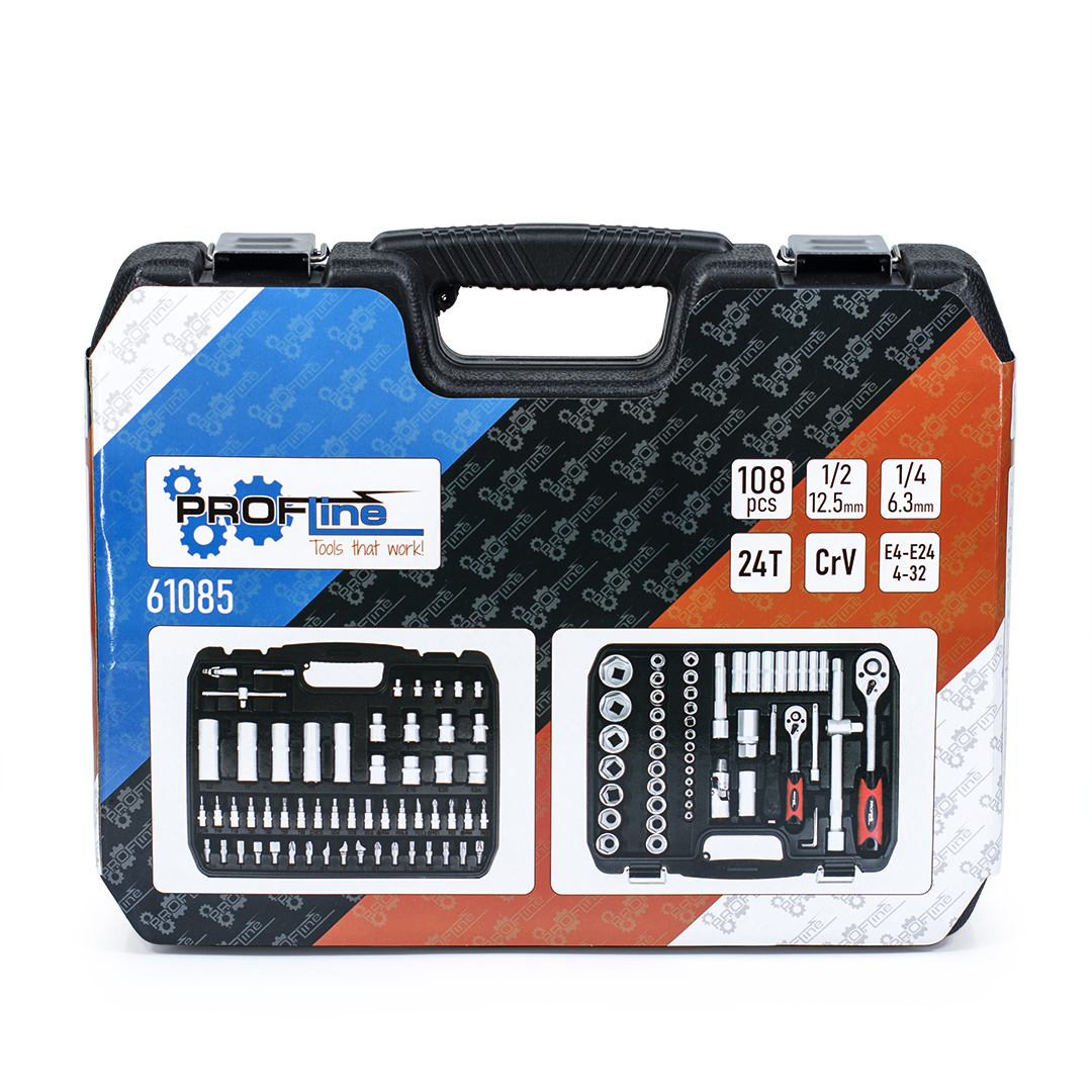 Набор инструмента марки Profline 61085, полупрофессиональный набор состоящий из 108 предметов. Отличный вариант в качестве автомобильного набора инструментов, набора инструментов для дома или в гараж. Поставляется в ударопрочном пластиковом кейсе с металлическими замками. Данный набор не ориентирован на использование в профессиональных целях. Подробная комплектация набора: