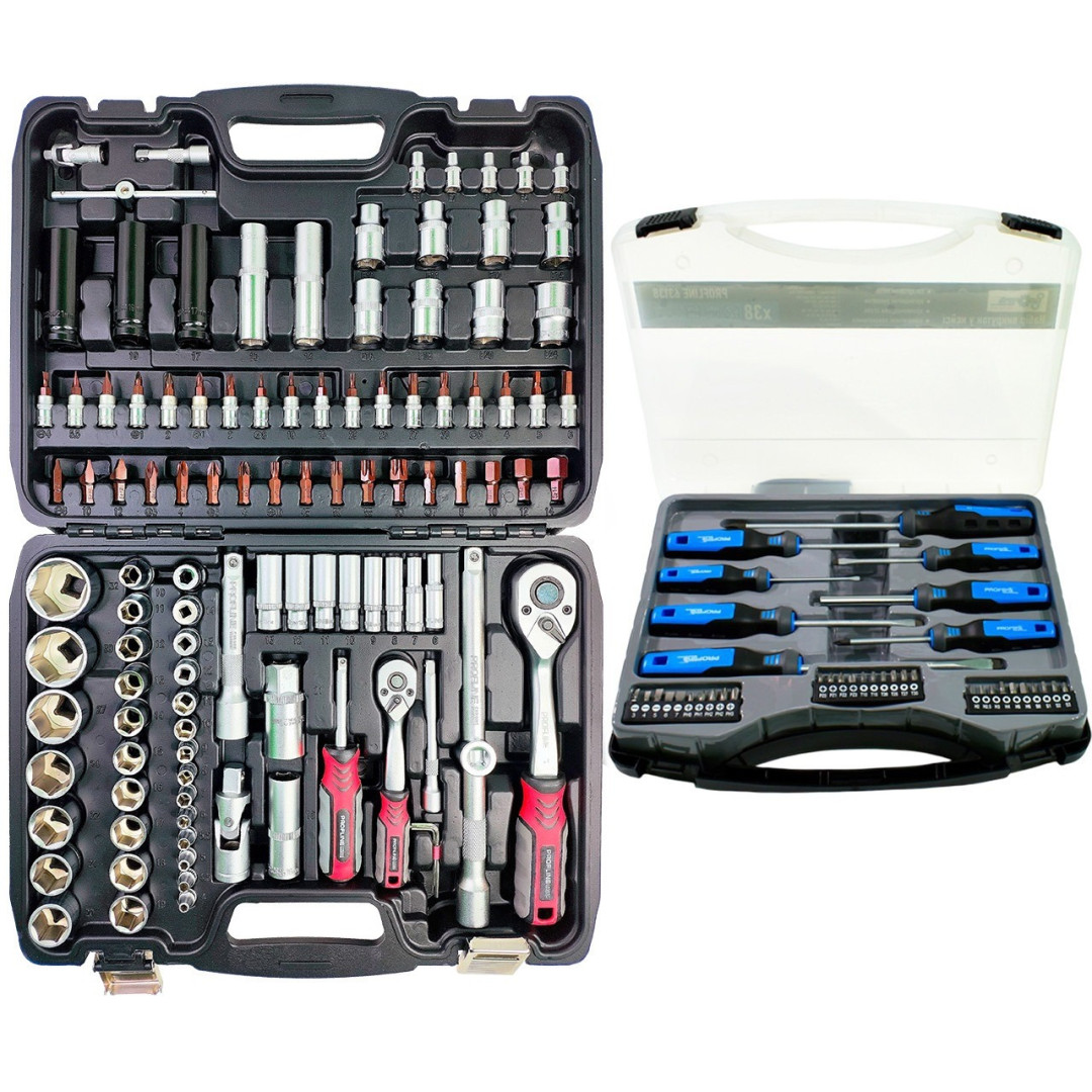 Набор инструментов 2в1 (набор профессиональных инструментов 1/2 "& 1/4" 111 ед., Cr-V + набор отверток профессиональных с набором бит 38 ед. в кейсе) Profline 61085-229