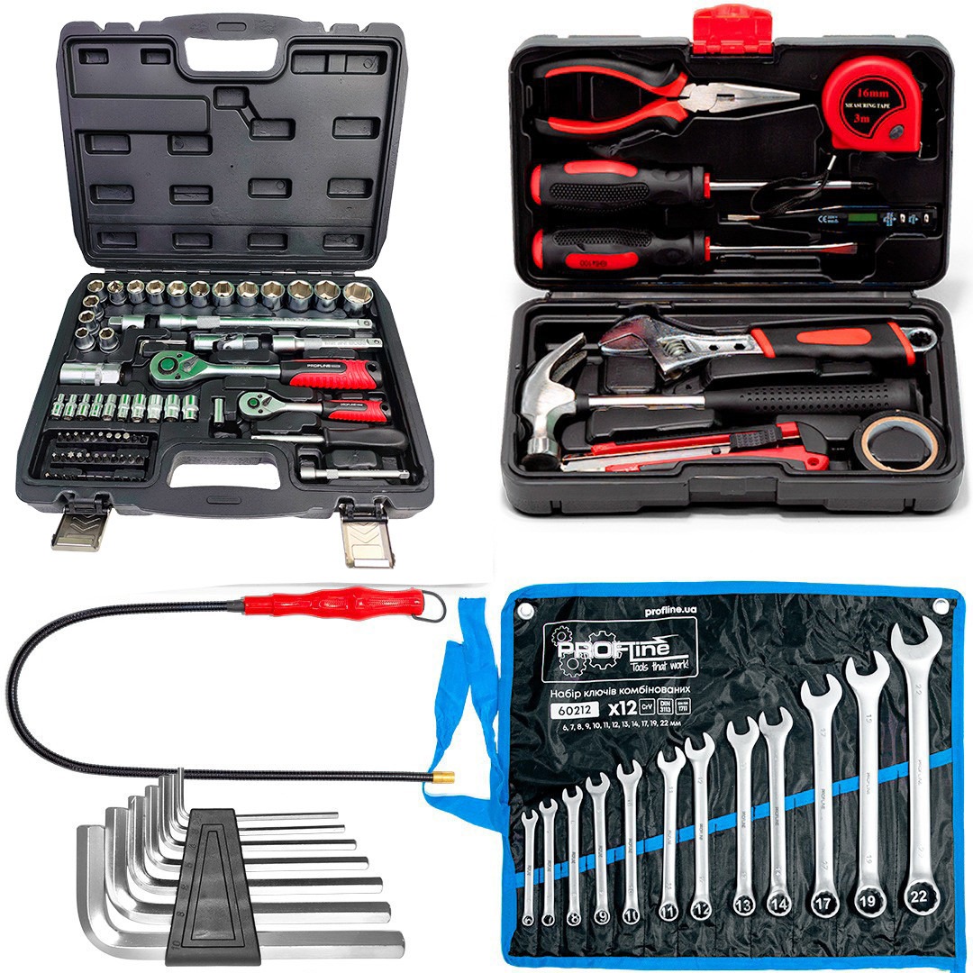 Набор инструментов 5в1 (набор 72 ед + набор инструмента слесарный 10 ед + нaбop шecтигpaнникoв Г-oбpaзныx 7eд + набор ключей комбинированных на холсте 12 ед + магнит на гибком удлинителе) Profline 60725-208