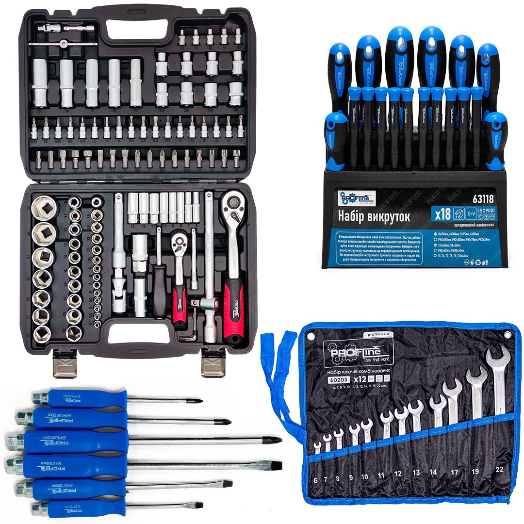 Набор инструментов 4в1 (набор 108 ед + набор отверток профессиональных 18 ед. + набор ключей 12ед + набор ударных отверток 6 ед) Profline 61085-004