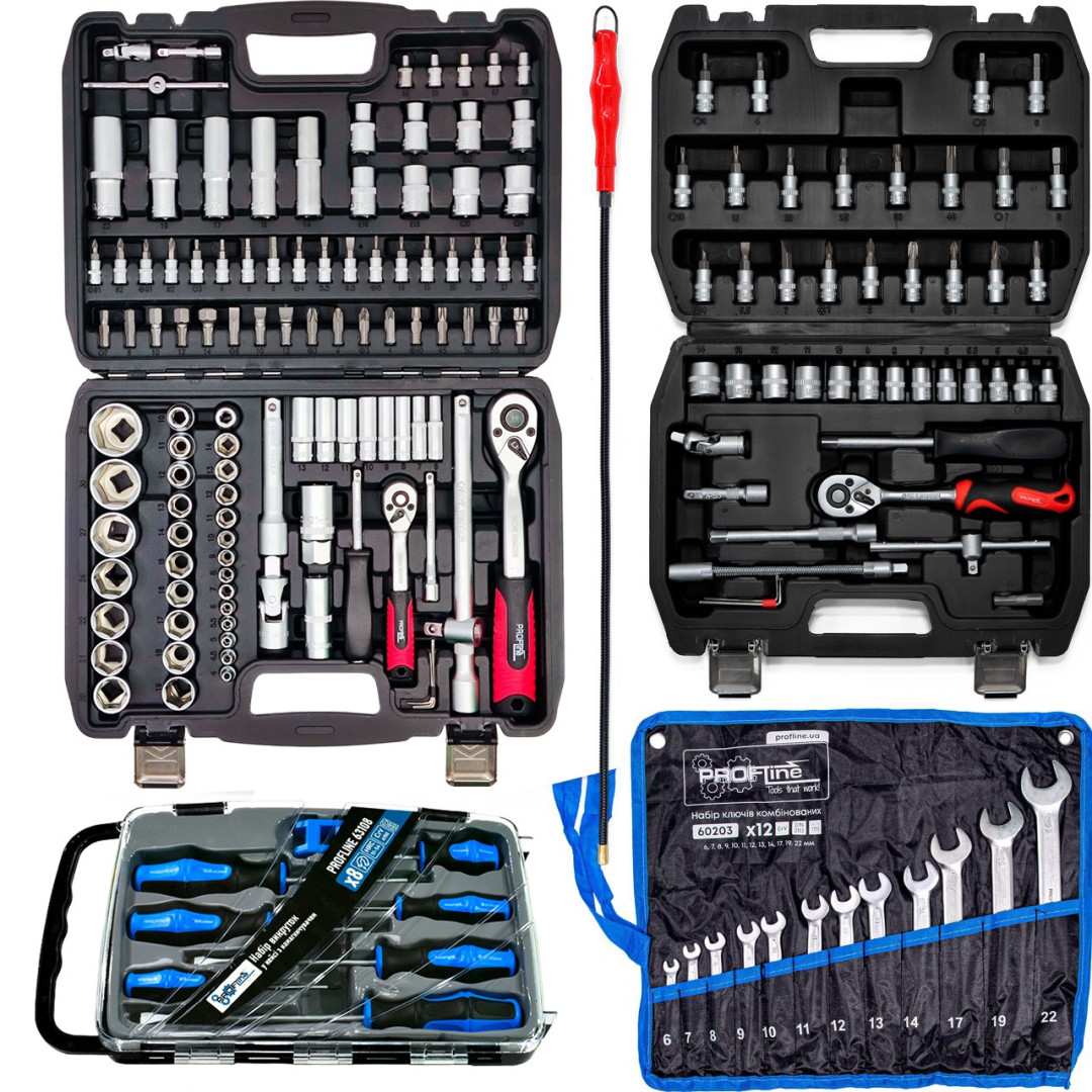 Набор инструментов 5в1 (набор 108 ед + набор 46 ед + ключи 12 ед + набор отверток профессиональных в кейсе 7 ед с намагничивателем + магнит) PROFLINE 61085-110