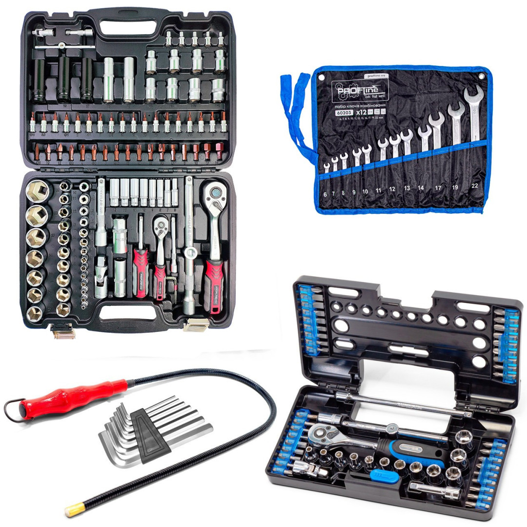 Наборы инструментов - это новое слово в поддержку качества и многофункциональности! Благодаря своей практичности идеально подходят для автолюбителей и домашних мастеров. Широкий выбор инструментов позволяет справиться почти с любым видом крепежа, что очень выручает при внезапных поломках в дороге и во время ремонтных работ в гараже.