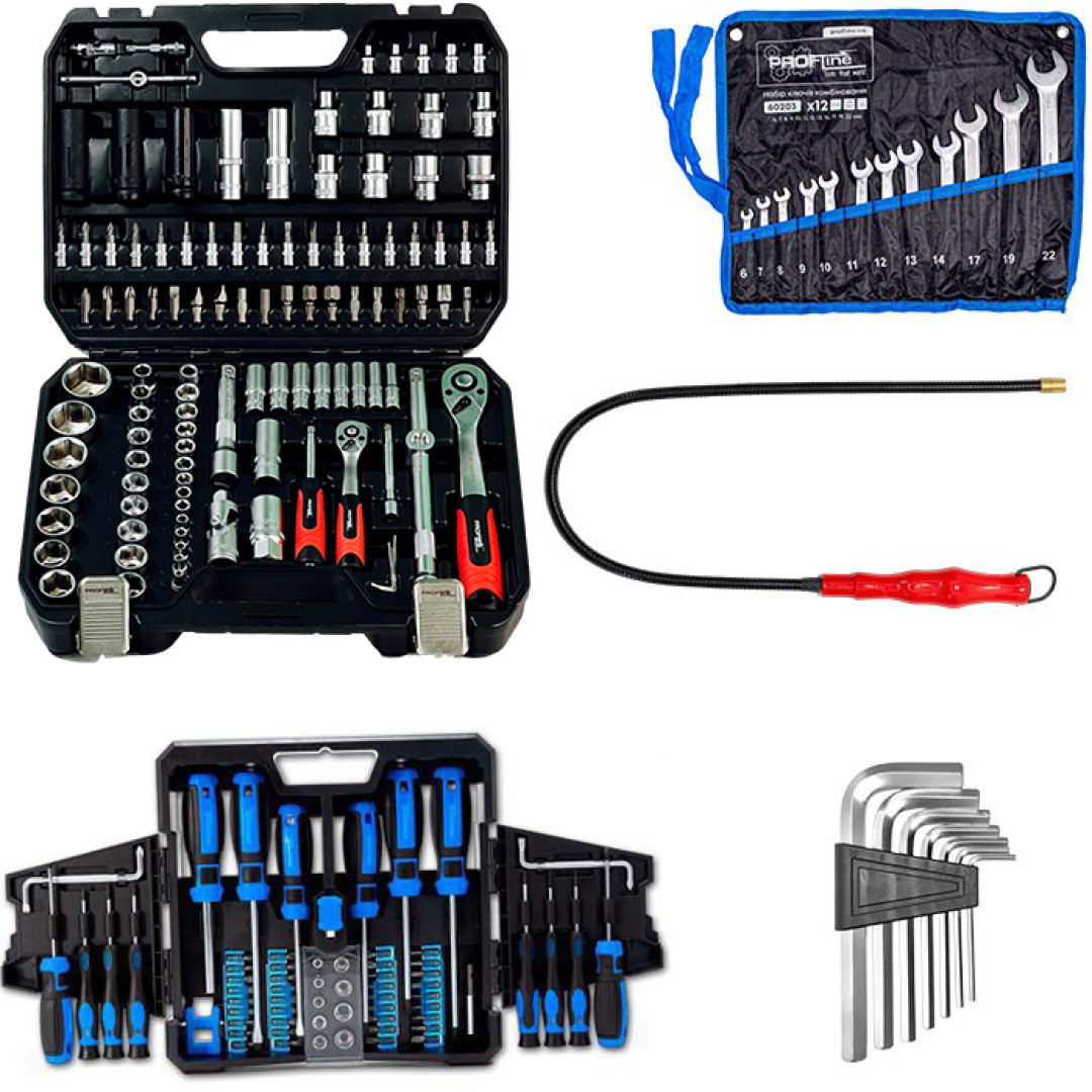 Набор инструментов 5в1 (набор профессиональных инструментов 1/2 "& 1/4" 111 ед.,Cr-V + набор отверток, бит и головок 63 ед. + нaбop шecтигpaнникoв Г-oбpaзныx 7 eд. + набор ключей комбинированных на холсте 12 ед. + магнит на гибком удлинителе) Profline 61085-215