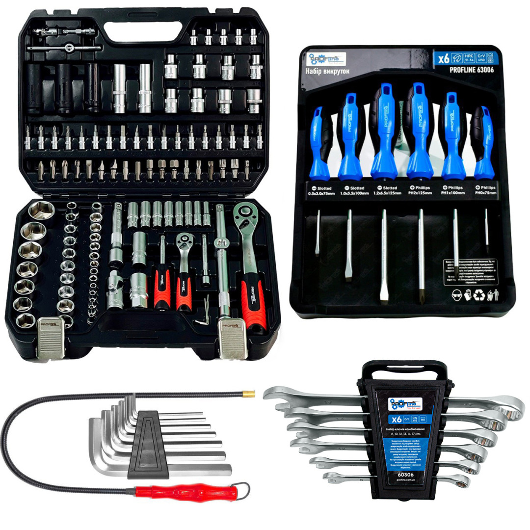 Набор инструментов 5в1 (Набор 111 ед, Набор ключей, Набор отверток 6 ед., гибкий удлинитель и шестигранники) Profline 61085-217
