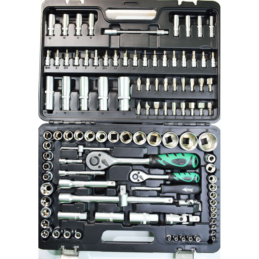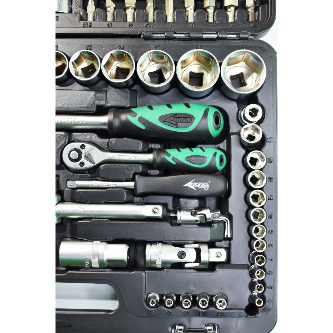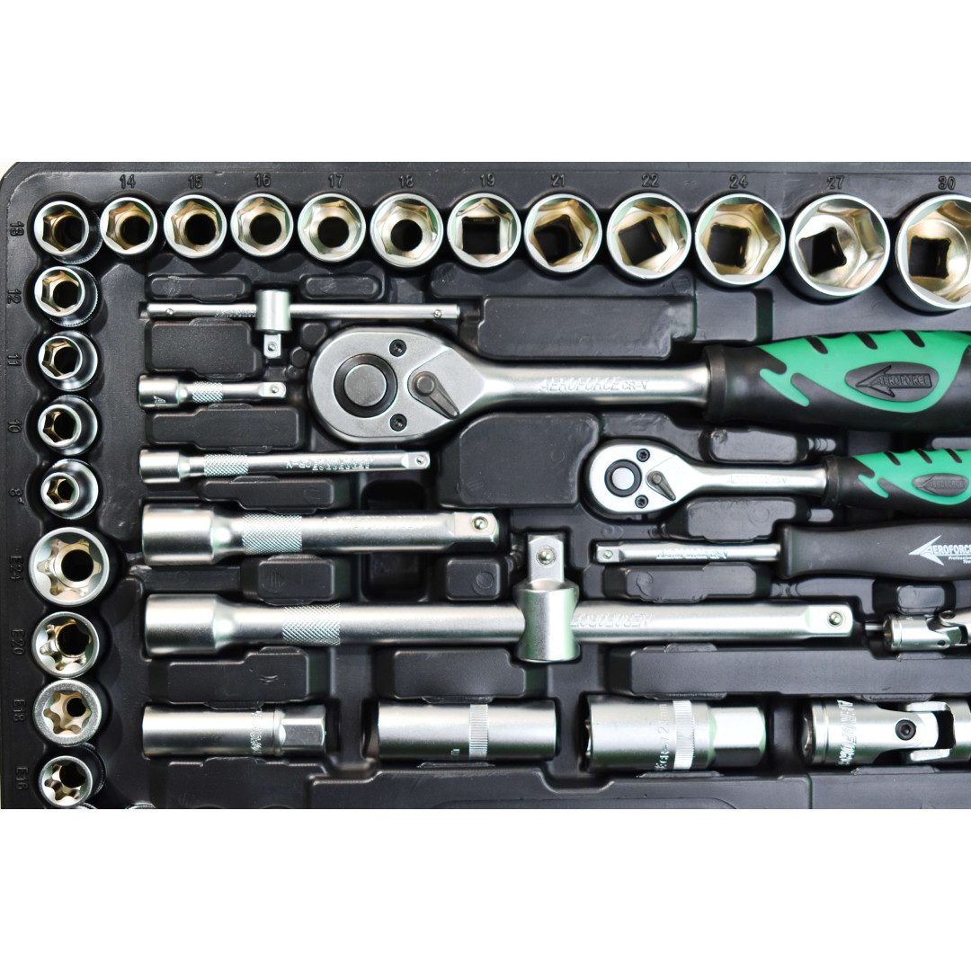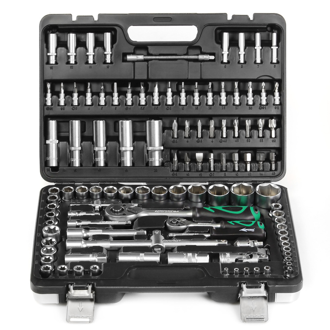 Набор инструментов Aeroforce 110 предметов. Профессионального качества Предназначен для использования в автосервисах и мастерских и других тяжёлых условиях.