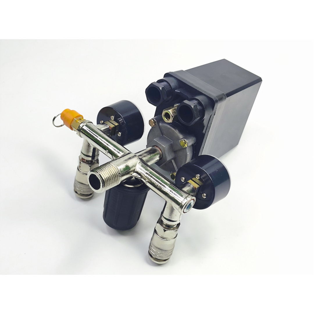 Контрольно-распределительный блок компрессора с регулятором давления состоит из металлической трубки с одним резьбовым входом, семи резьбовых выходов и регулятора давления мембранного типа. Устанавливается на источнике сжатого воздуха для последующего снижения давления с помощью регулятора. Два выхода предназначены для монтажа на них запорных клапанов (один — регулируемый через редуктор, второй нерегулируемый), два - для манометров, один для монтажа прессостата, один для предохранительного клапана и на одном установлена пластиковая заглушка. Механизм регулятора давления мембранно-пружинный.