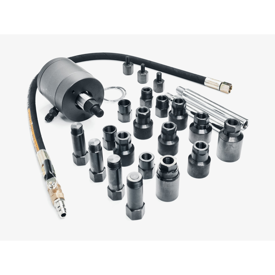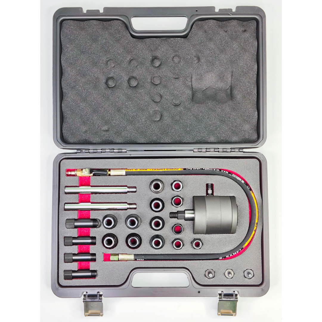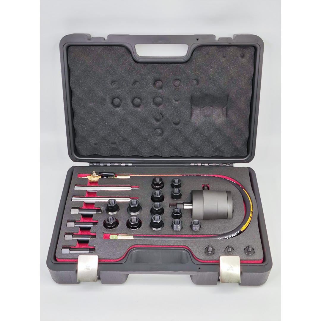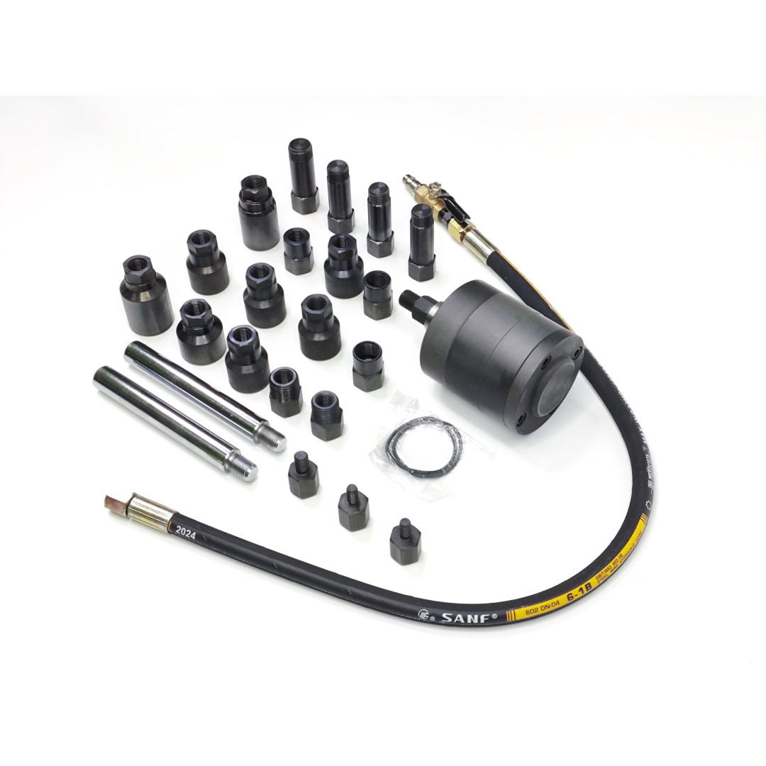 Пневматический съемник форсунок 30835 — профессиональный набор для быстрого, безопасного и эффективного демонтажа заклинивших или корродированных форсунок дизельных двигателей. Инструмент использует импульсную воздушную вибрацию (ударный механизм), что позволяет извлекать форсунки без дополнительной разборки головки блока цилиндров и минимизирует риск повреждений. Набор упакован в прочный кейс — удобно хранить и транспортировать; адаптеры охватывают широкий спектр типов форсунок, благодаря чему инструмент подходит для большинства современных авто и грузовой техники.