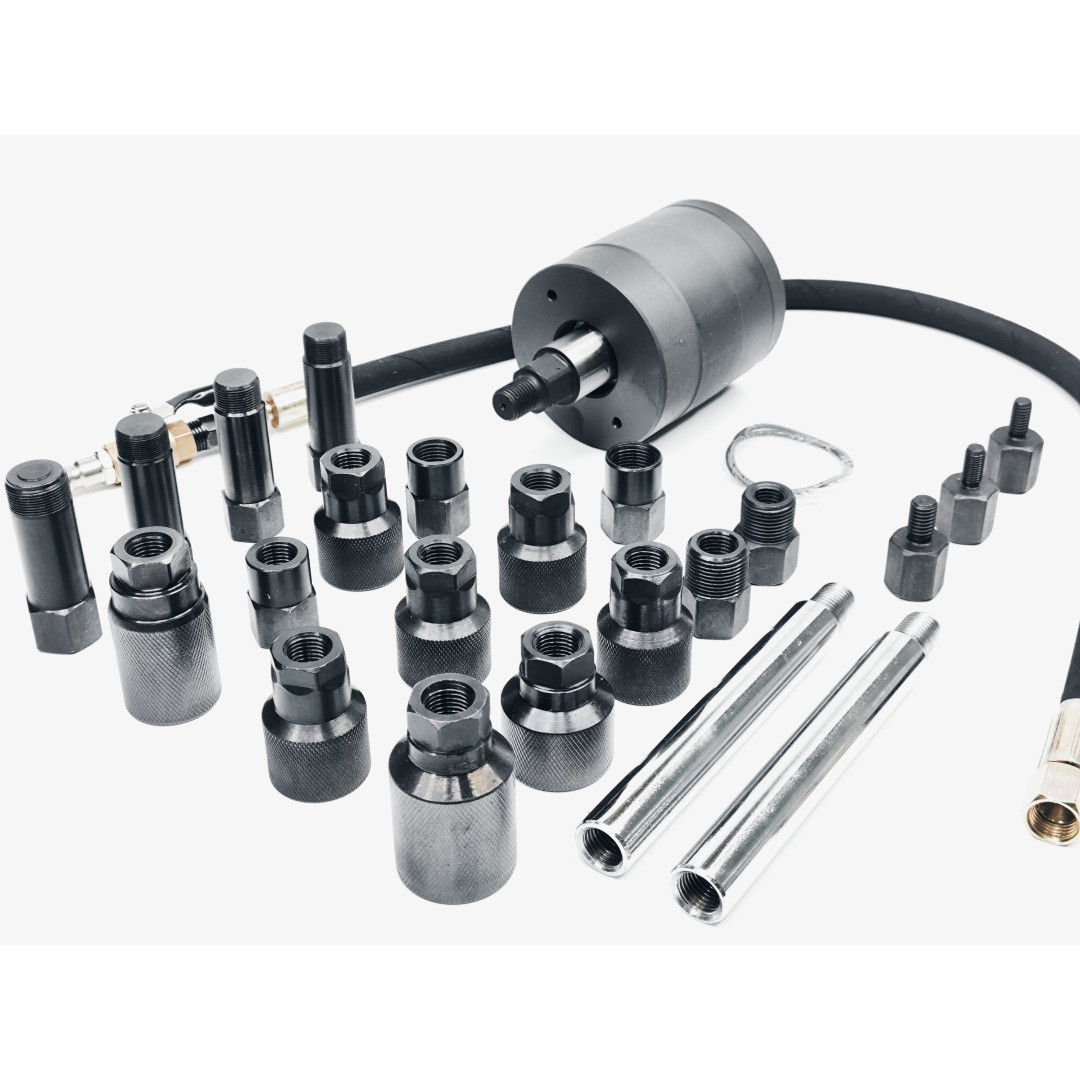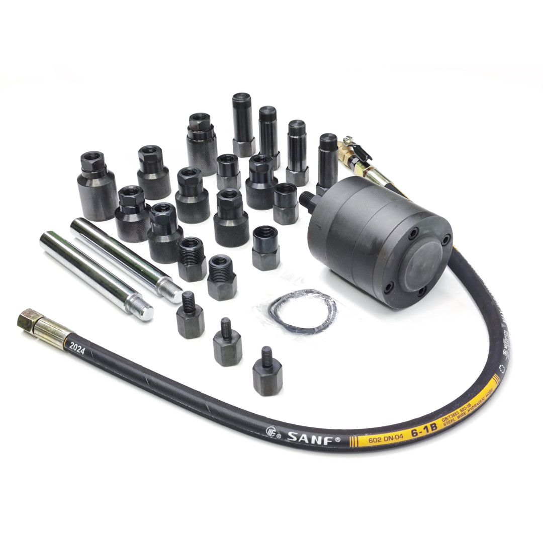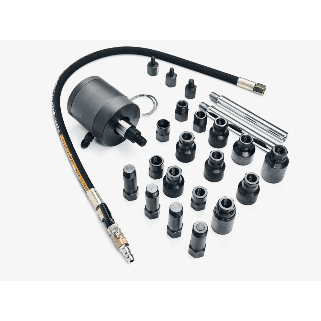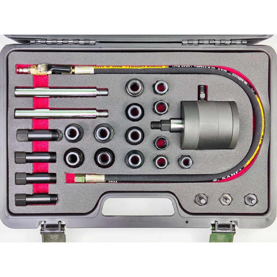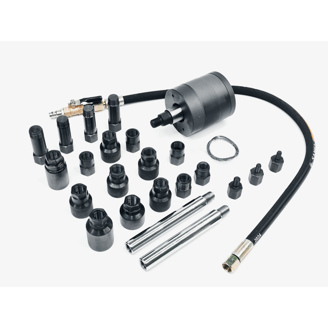 Пневматический съемник форсунок 30835 — профессиональный набор для быстрого, безопасного и эффективного демонтажа заклинивших или корродированных форсунок дизельных двигателей. Инструмент использует импульсную воздушную вибрацию (ударный механизм), что позволяет извлекать форсунки без дополнительной разборки головки блока цилиндров и минимизирует риск повреждений. Набор упакован в прочный кейс — удобно хранить и транспортировать; адаптеры охватывают широкий спектр типов форсунок, благодаря чему инструмент подходит для большинства современных авто и грузовой техники.