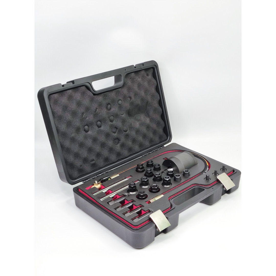 - Резьбовые размеры и совместимость: широкий набор метрических адаптеров для внутренней/внешней резьбы (охватывает большинство типов форсунок — Bosch, Denso, Delphi, Siemens CR и др.).