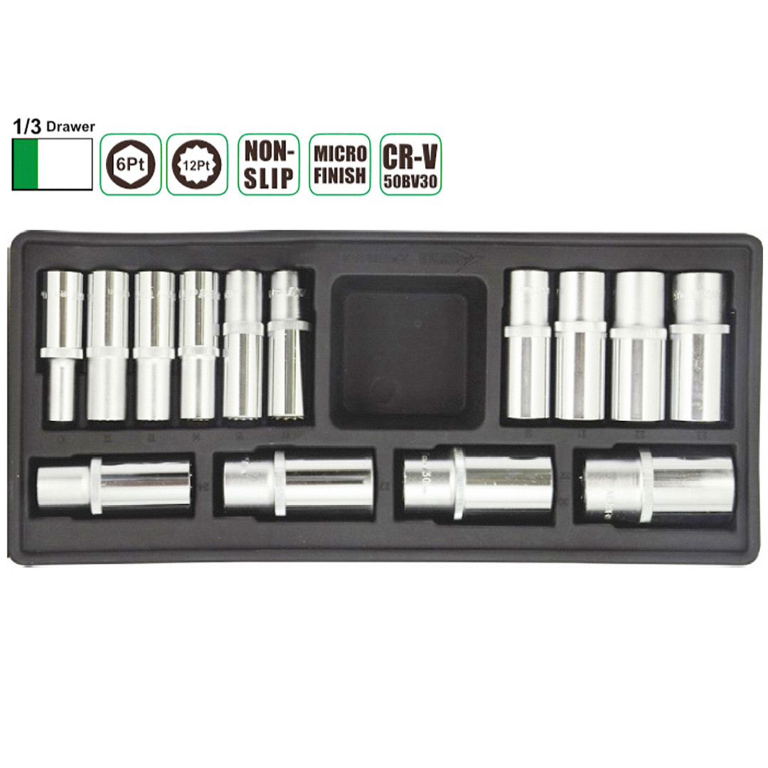14 шт.: 1/2" Глубокая головка: 10, 12, 13, 14, 15, 17, 19, 21, 22, 24, 27, 30, 32 мм;