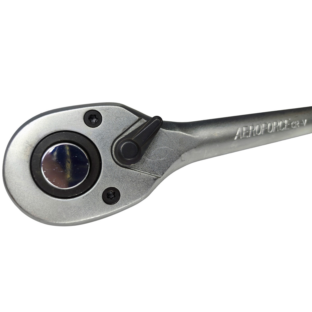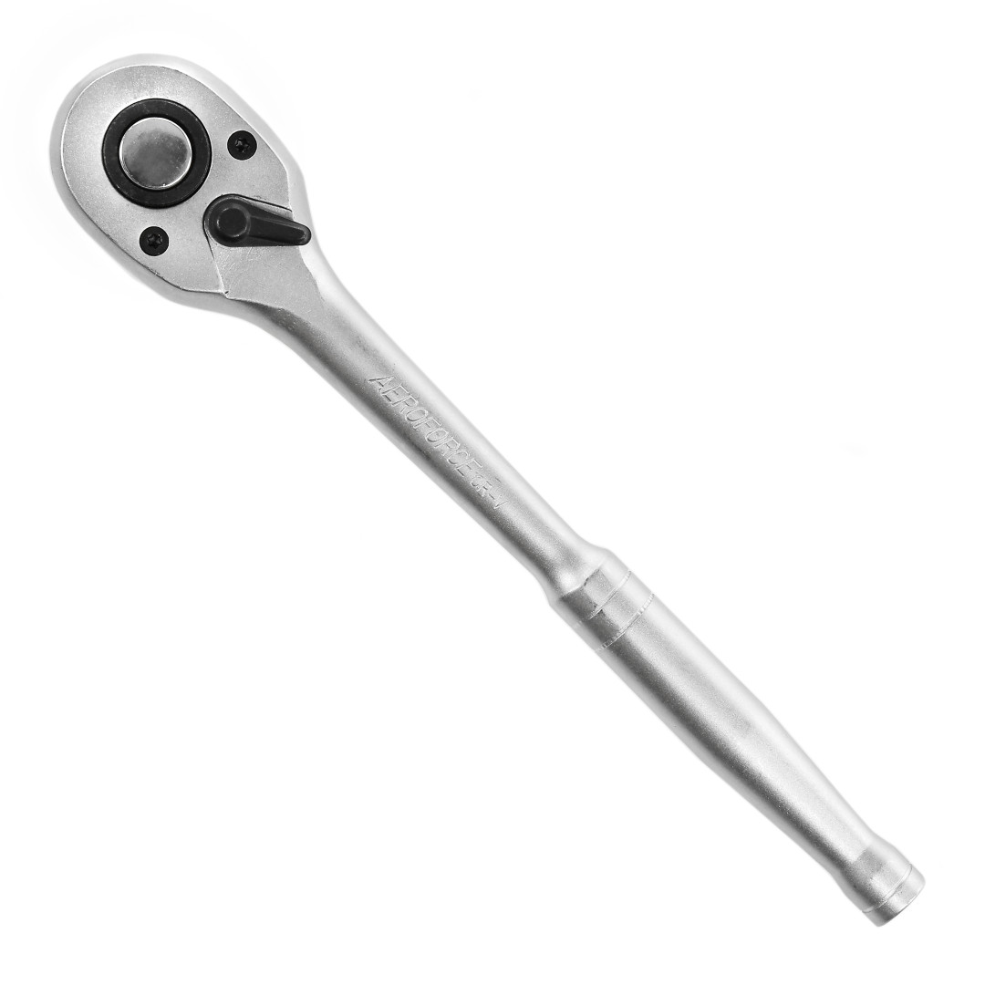 Хромированный ключ-трещотка Aeroforce J0503 из стали CrV, размером 1/2 дюйма, с переключателем, — ручной инструмент для монтажа и демонтажа резьбовых соединений. Совместим с торцевыми головками, имеющими посадочное гнездо 1/2 дюйма. Оснащен храповым механизмом, облегчающим работу в труднодоступных местах. Инструмент применяется для ремонта техники, автомобилей, также используется в быту.